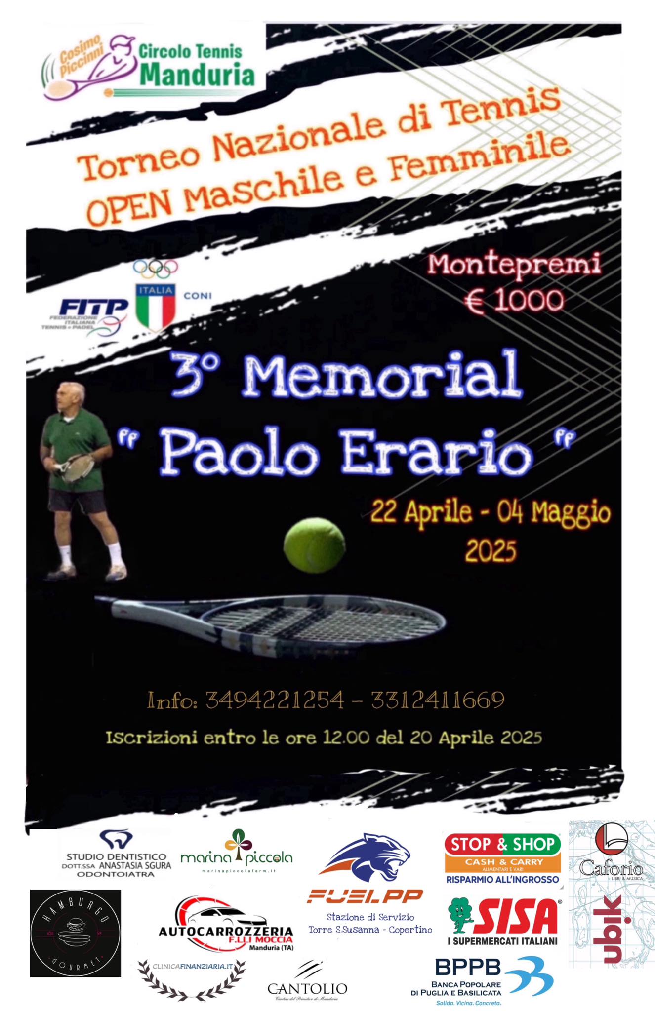 Ritorna, dal 22 aprile prossimo, il torneo nazionale di tennis open intitolato a Paolo Erario, giunto alla terza edizione. Paolo Erario, come si ricorderà, ha dedicato la sua vita, oltre che al lavoro e alla famiglia, a questa sua grande passione: il tennis. Il Circolo Tennis Manduria e tutti gli appassionati onorano la sua memoria aderendo a questo evento agonistico, che pone un montepremi interessante:ben 1.000 euro.