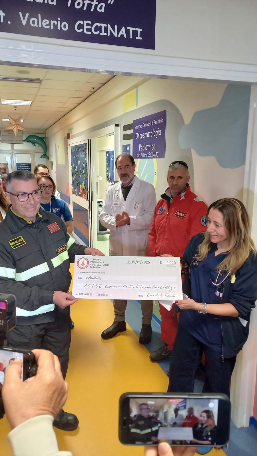 Stamattina una delegazione dei Vigili del Fuoco del Comando Provinciale di Taranto ha fatto visita ai bambini in cura ai reparti di Pediatria e Oncoematologia pediatrica dell’ospedale di Taranto. Giochi con i bambini e la donazione ad AGTOE di mille euro, raccolti tramite donazioni volontarie, per le esigenze del reparto