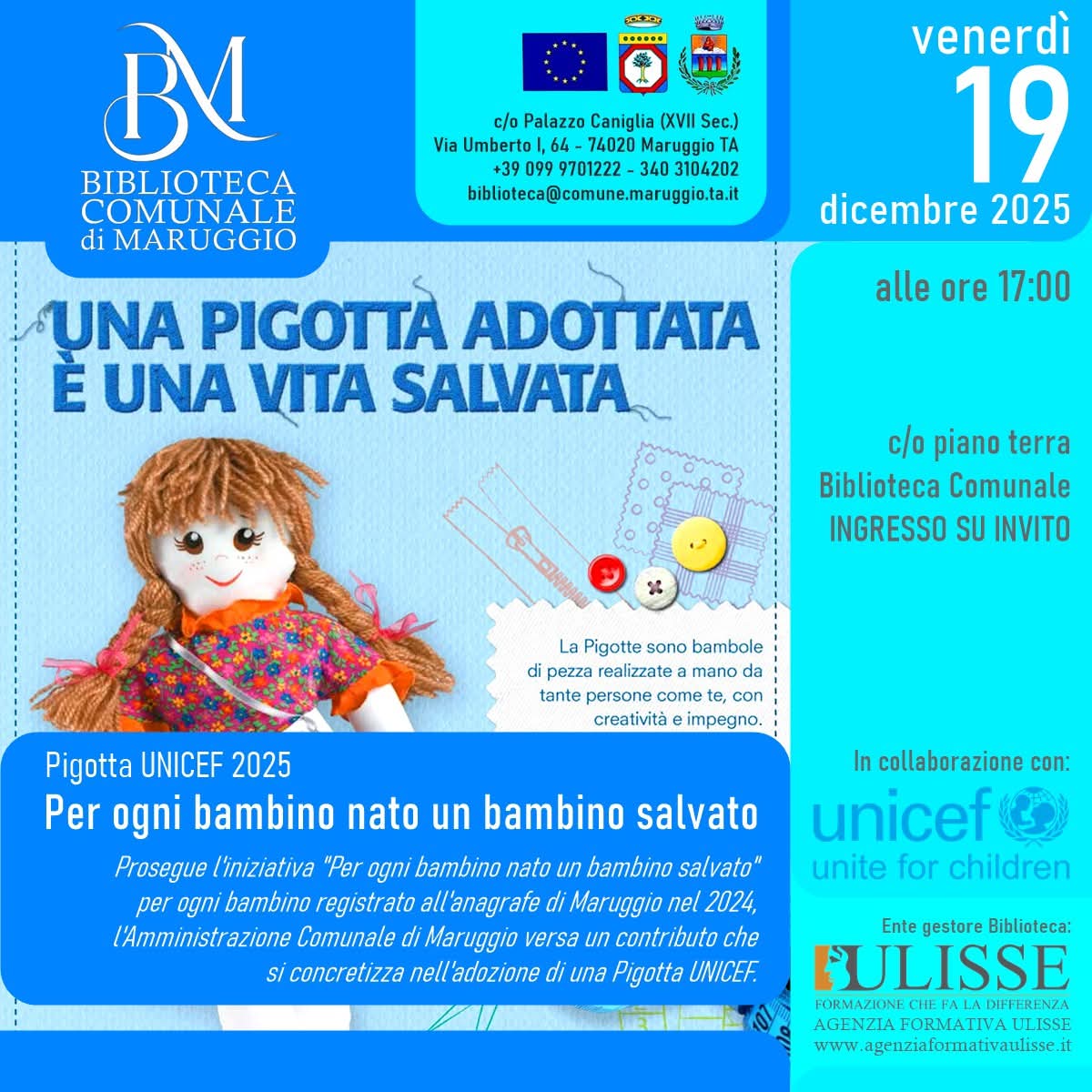Prosegue l’iniziativa “Per ogni bambino nato, un bambino salvato”: per ogni bambino registrato quest’anno all’anagrafe di Maruggio, l’Amministrazione versa un contributo che si concretizza nell’adozione di una Pigotta UNICEF.