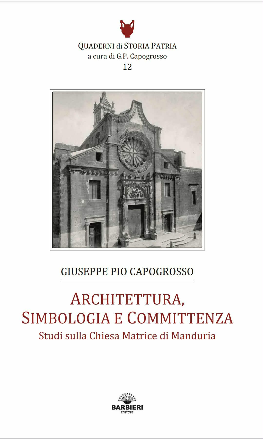 Questo è il contenuto del recente lavoro dell’avv. Giuseppe Pio Capogrosso dal titolo “Architettura, simbologia e committenza - Studi sulla chiesa matrice di Manduria”, un testo appena pubblicato per i tipi dell’editore Barbieri nella collana “Quaderni di Storia Patria”, ora disponibile in libreria.