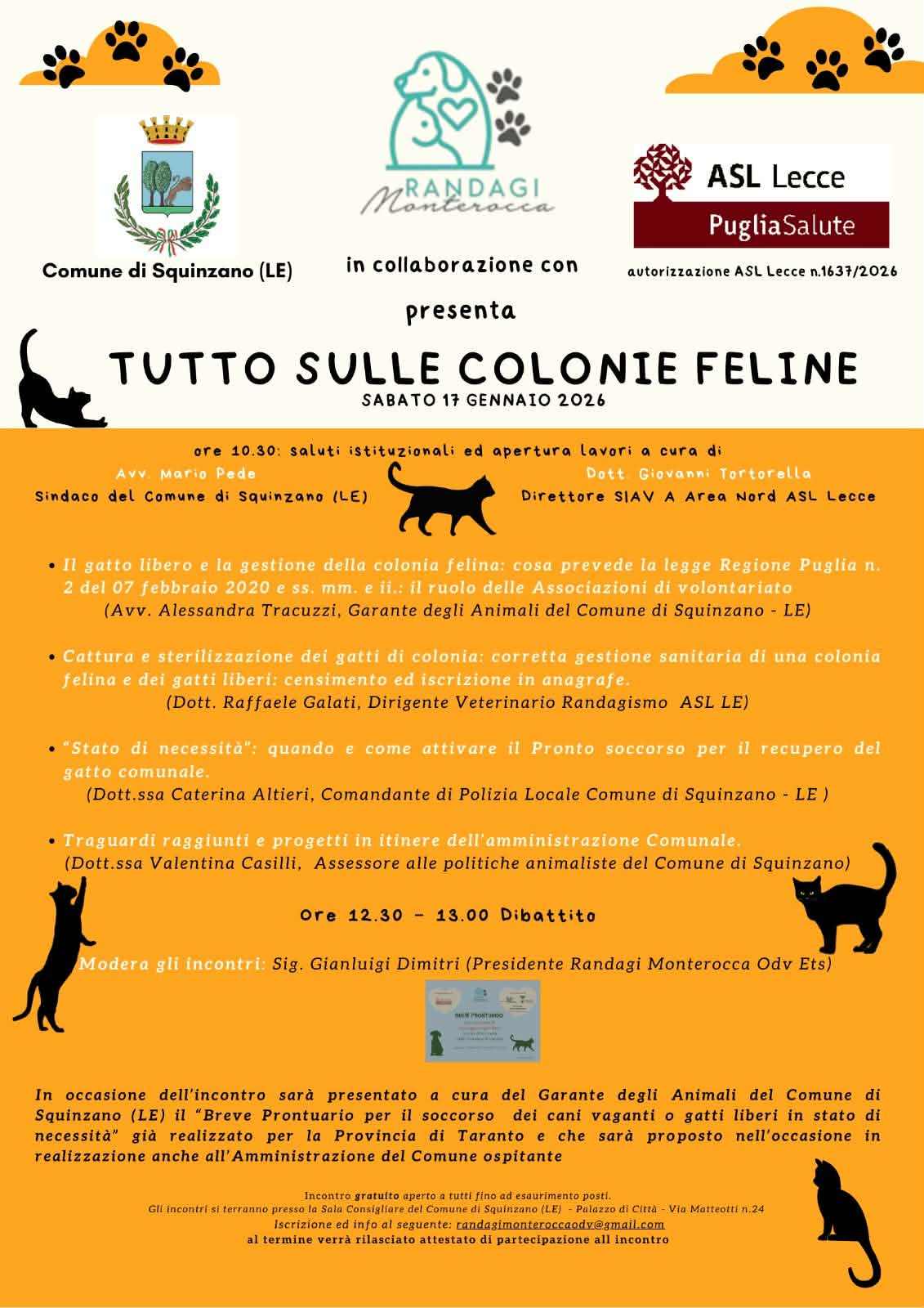 L’associazione Randagi Monterocca, in collaborazione con l’Amministrazione comunale di Squinzano e della ASL di Lecce, presenta il suo nuovo progetto di divulgazione ed informazione in materia di gatti liberi e colonie feline nella Regione Puglia.