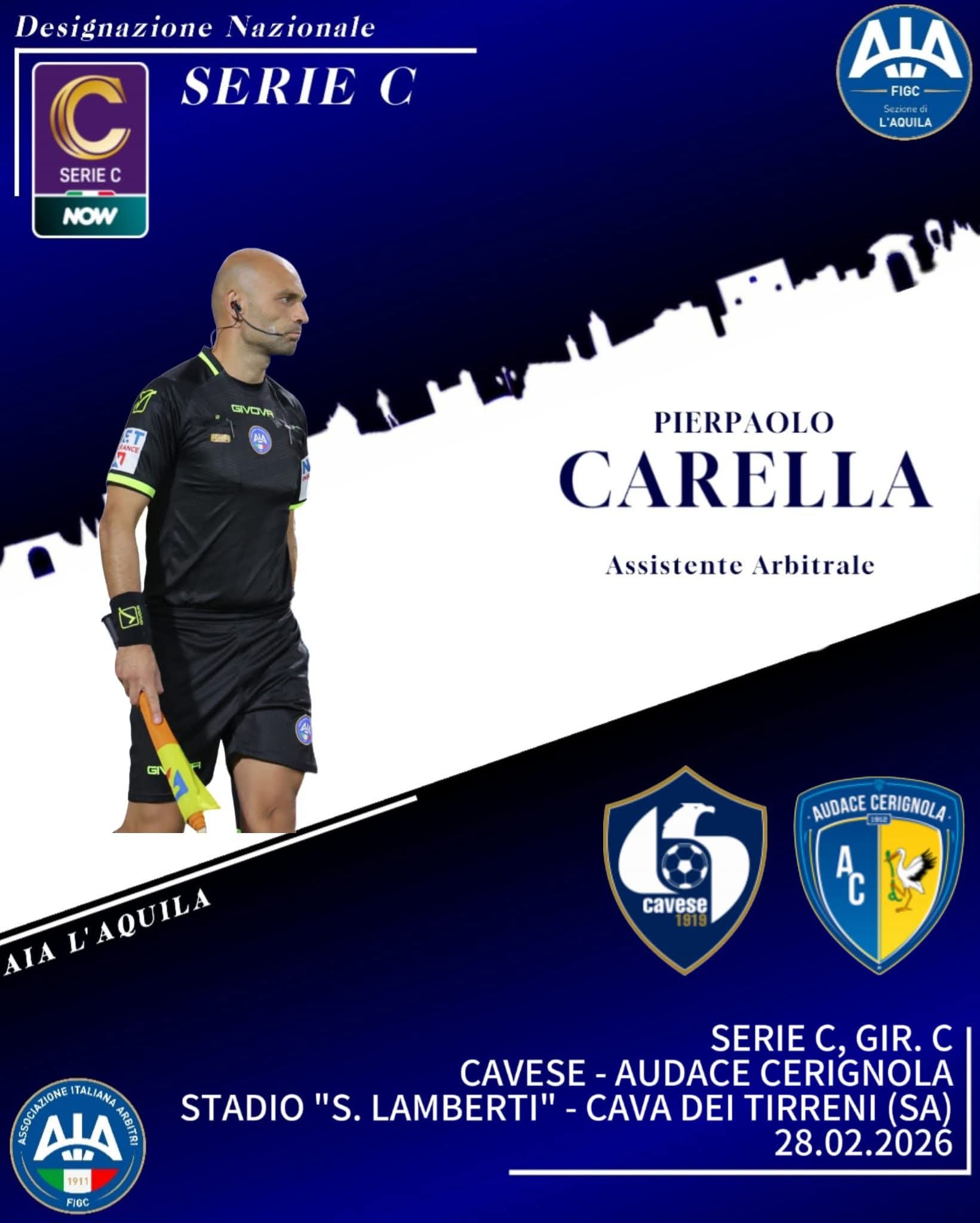 Pierpaolo Carella, iscritto alla sezione AIA de L’Aquila, è stato designato come primo assistente per l’incontro fra Cavese e Cerignola, inserita nel programma della nuova giornata del girone C della serie C (si disputerà domani pomeriggio, sabato, alle ore 14,30, a Cava de Tirreni).