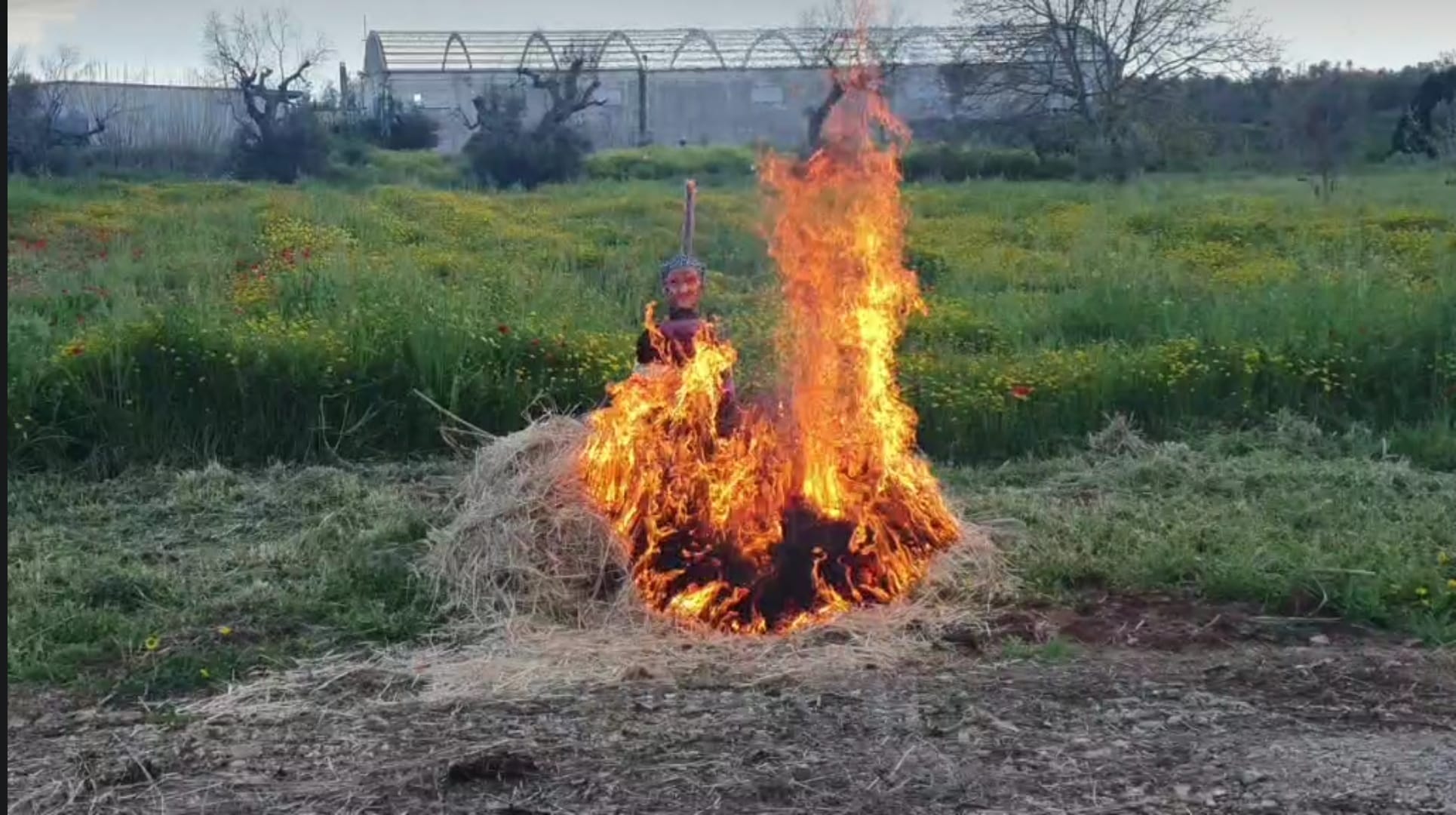 Terminata la Quaresima, con la celebrazione della Resurrezione (che fino agli anni ‘50 del Novecento avveniva a mezzogiorno del Sabato Santo), il fantoccio, ormai privo dei taralli, con l’arancia secca senza più penne, veniva rimosso e, solitamente, bruciato in un fuoco purificatore che sanciva la fine del periodo di penitenza e annunciava l’avvenuta Resurrezione: «Si putìa puru bruciari, ca ti pezza era, ‘ncerti la sapìunu puru fari, comu nna cristiana vera, ma puei quannu si ni llea la bruciaunu» (Gregoria D.). Una sola fonte ha affermato che il fantoccio veniva ‘fucilato’: «la mintìumu a mmienzu a lli feli e puei, quannu era propria la fini ti la Quaresima, unu scia cu lu fucili e la sci sparava» (Carmela C.).