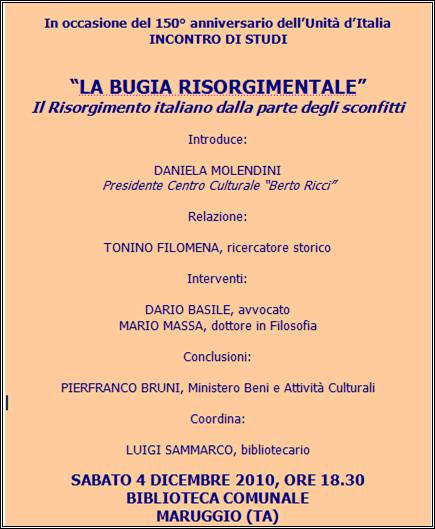 provocatorio convegno di studi sul “Risorgimento incompiuto”, che affronterà il tema della “bugia risorgimentale” lungo una discussione che prenderà spunto dalla problematica generale, ovvero: “La bugia risorgimentale. Il Risorgimento italiano da parte degli sconfitti”.L’incontro di studio, organizzato dal Centro Culturale “Berto Ricci”, si svolgerà nella sala della Biblioteca Comunale di Maruggio di Taranto, sabato 4 dicembre prossimo con inizio alle ore 18,30, e vedrà relatori Tonino Filomena, Dario Basile, Mario Massa, Daniela Molendini.