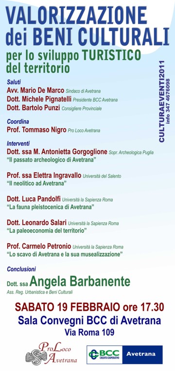 Loco di Avetrana il convegno in oggetto. L’evento rientra nella programmazione “Culturaeventi 2011” e specificatamente nel filone che si occupa di Turismo. Infatti, sono diversi gli appuntamenti organizzati dalla nostra associazione, si legge in una nota del Presidente Emanuele Micelli, tendenti ad affrontare le diverse tematiche e difficoltà del nostro territorio inerenti il Turismo che secondo noi è una fonte di ricchezza, quasi per niente sfruttata ma che potrebbe essere importante per l’economia futura avetranese. In questo appuntamento parleremo dei Beni Culturali presenti e del loro stato a volte anche di abbandono degli stessi.Dopo i saluti iniziali del sindaco De Marco Mario, del consigliere provinciale Bartolo Punzi e del presidente della BCC di Avetrana Michele Pignatelli che ha patrocinato l’iniziativa, dimostrando particolare interesse, interverranno: