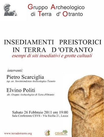 Archeologico di Terra d'Otranto”. Il tema del primo appuntamento, che si terrà sabato 26 febbraio 2011 presso la Sala Conferenze del CSVS, (Centri di Servizio per il Volontariato) di Lecce, sito in via Sicilia 21, a partire dalle h. 19,00, sarà : “Insediamenti preistorici in Terra d'Otranto, esempi di siti insediativi e grotte culturali”.Durante la serata saranno presi in considerazione in particolar modo i siti neolitici e le grotte di Avetrana insieme alla Grotta dei Cervi di Porto Badisco. Elvino Politi parlerà dei graffiti e delle pitture murali rinvenibili all’interno della Grotta dei Cervi scoperta il 1° febbraio del 1970 dal gruppo speleologico "Pasquale de Lorentiis" di Maglie, proponendo nuove ipotesi circa la loro interpretazione. Quest’ultima presenta infatti nei suoi anfratti numerosissime iscrizioni in guano e ocra rossa dell’era neolitica, rimaste intatte nel tempo in tutto il loro fascino e nitidezza. Pietro Scarciglia, geologo e ricercatore, già Isp. On. per la Soprintendenza Archeologica di Taranto, illustrerà la nascita della Puglia, dei fenomeni carsici e delle grotte avetranesi. In questa zona è venuto infatti alla luce, nell’estate del 2002, nell’area della Masseria della Marina, un insediamento umano con resti di capanne e attigua area funeraria, mentre in località la Grava sono stati rinvenuti nel 2005 reperti fossili di fauna Pleistocenica. I reperti di entrambe queste aree sono custoditi all’interno della Casamatta del Torrione di Avetrana.