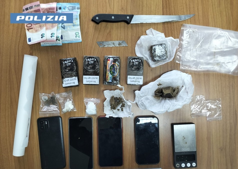 Nella successiva perquisizione personale i poliziotti hanno recuperato altri 20 grammi di hashish divisi in dosi e quattro telefoni cellulari.