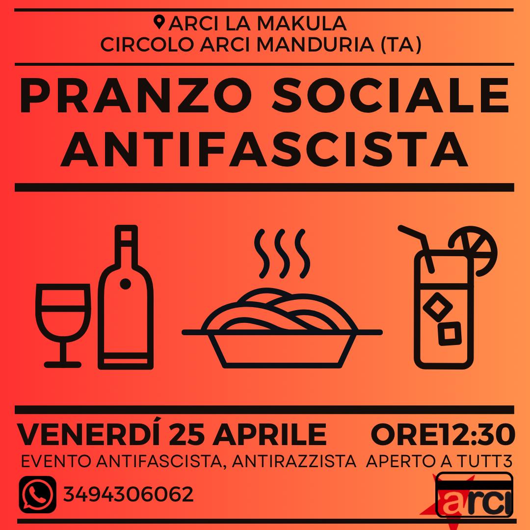 Il circolo ARCI “La Makula” organizza per il prossimo 25 aprile un “Pranzo sociale antifascista” nella propria sede sita al km 3 della sp. Manduria-Avetrana, per celebrare l’Ottantesimo anniversario della Liberazione dal nazi-fascismo.