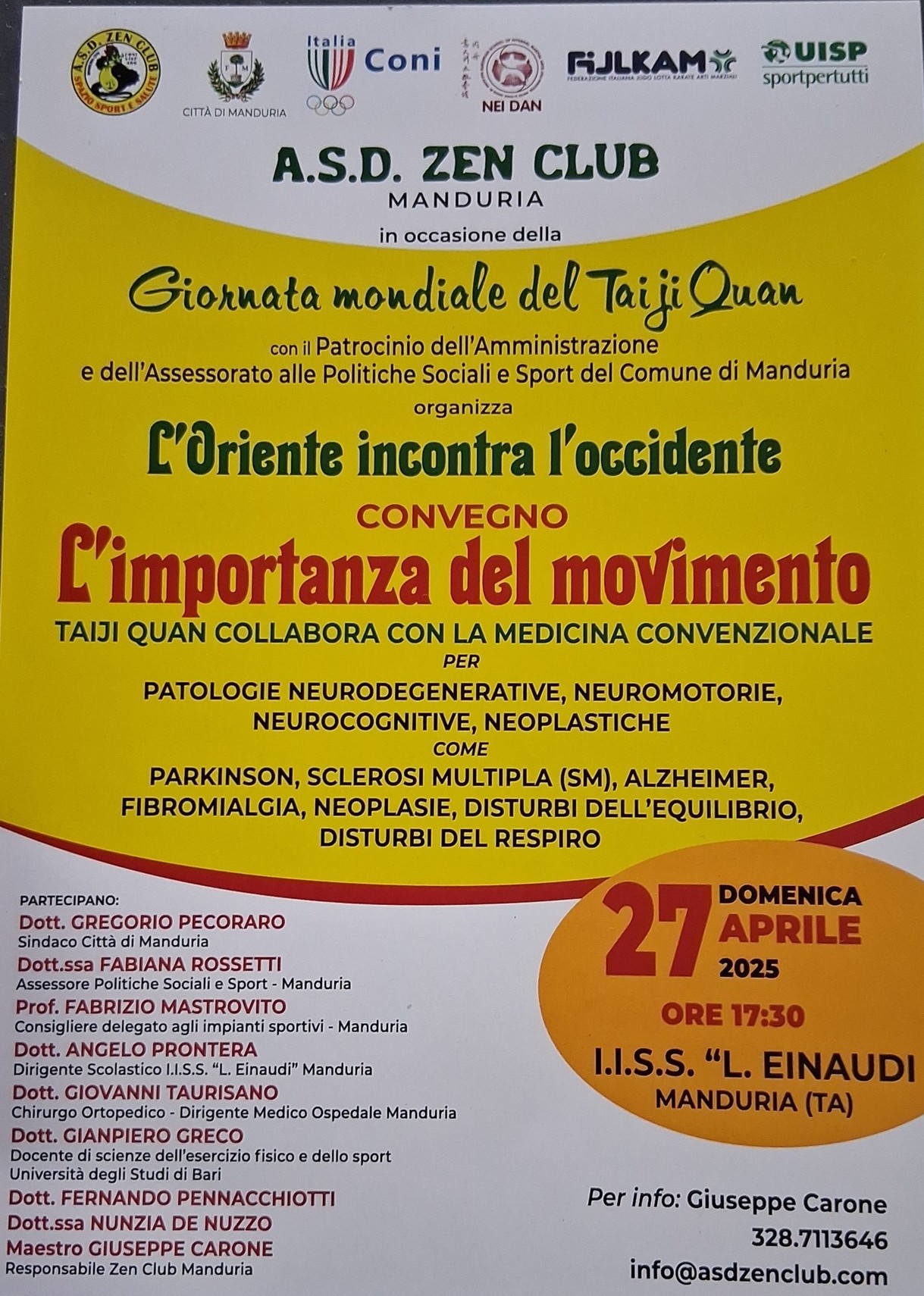 Lo Zen Club di Manduria, in occasione della Giornata Mondiale del TaijiQuan, che si celebra ogni anno l’ultimo sabato del mese di aprile, promuove un convegno sul trema “L’Oriente incontra l’Occidente - L’importanza del movimento” - Progetto AFA (Attività Fisica Adatta tramite il Taiji e Qi Gong)”. Si svolgerà domenica 27 aprile, alle ore 17,30, presso la sede dell’istituto Einaudi di Manduria.