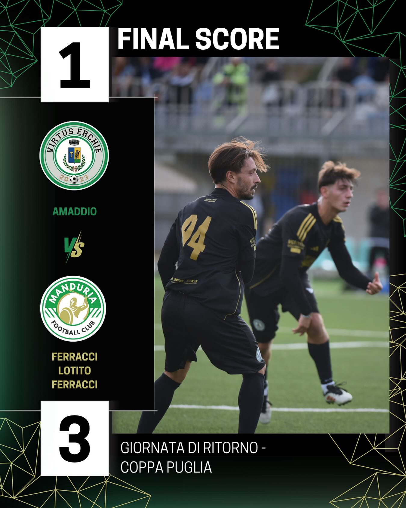 Ancora un successo per il Football Club Manduria, che conquista la qualificazione al secondo turno di Coppa Puglia battendo a domicilio la Virtus Erchie con il punteggio di 3-1. Confronto fra due delle squadre più forti di tutta la Prima Categoria pugliese, deciso dalla doppietta di Ferracci e dal gol di Lotito; per la Virtus Erchie in rete Amaddio.