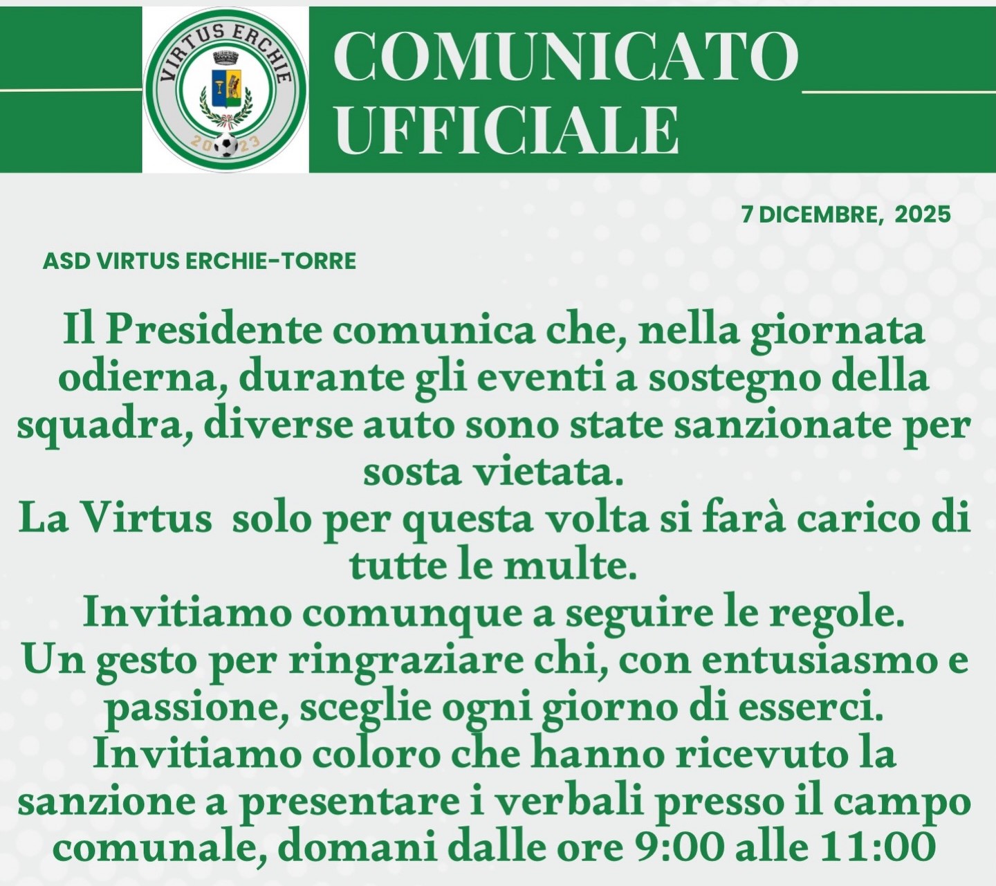 «Il presidente comunica che, nella giornata di domenica 7 dicembre, durante gli eventi a sostegno della squadra, diverse auto sono state sanzionate per sosta vietata» è riportato nella pagina social della squadra di Erchie.