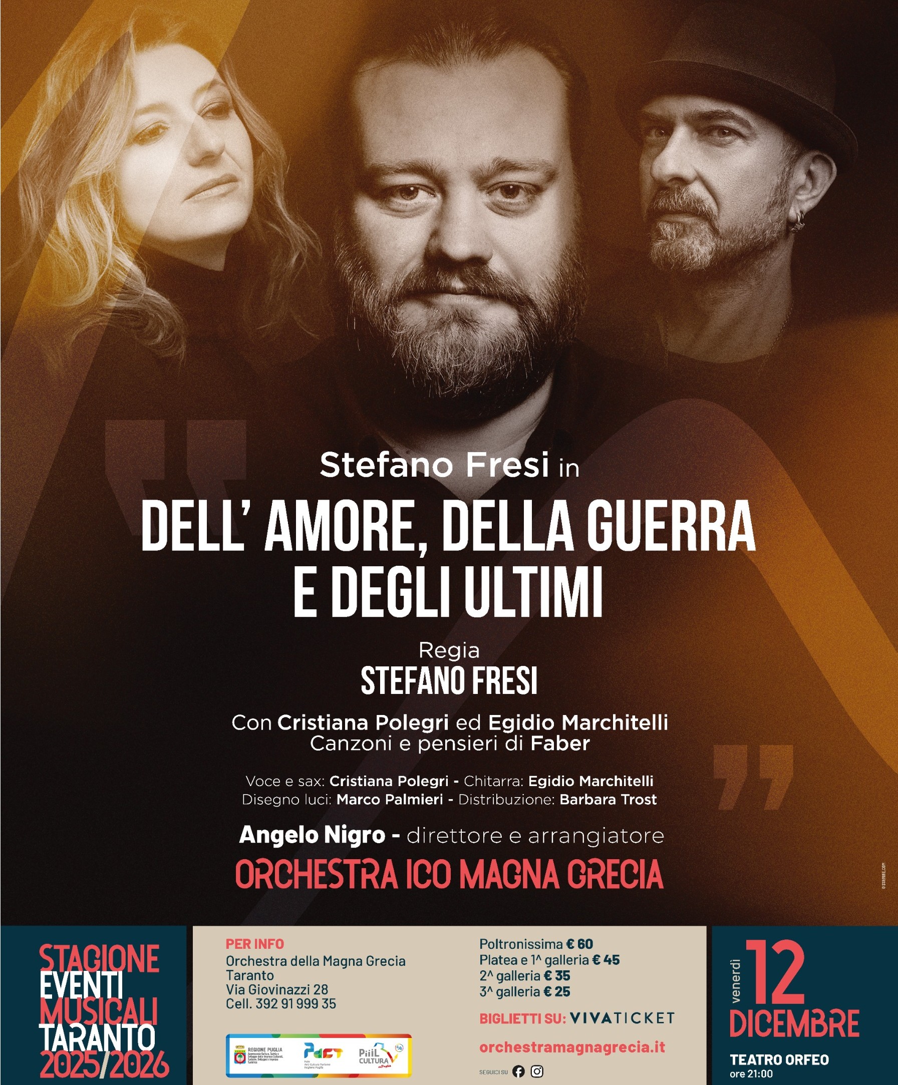 Venerdì 12 dicembre, alle 21, teatro Orfeo di Taranto: “Dell’Amore, della Guerra e degli Ultimi”, con Stefano Fresi e l’Orchestra ICO della Magna Grecia diretta dal maestro Angelo Nigro Poltronissima: 60 euro; Platea e I Galleria: 45euro; II Galleria: 35euro; III Galleria: 25euro.